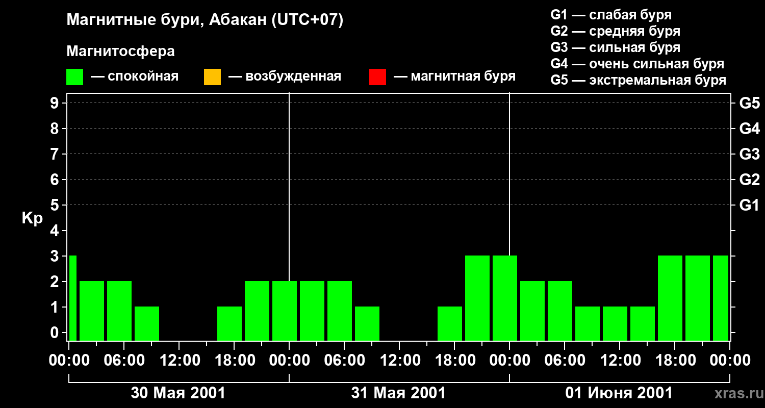 Изменения геомагнитного индекса Kp с 30 мая по 1 июня 2001 года для средних широт