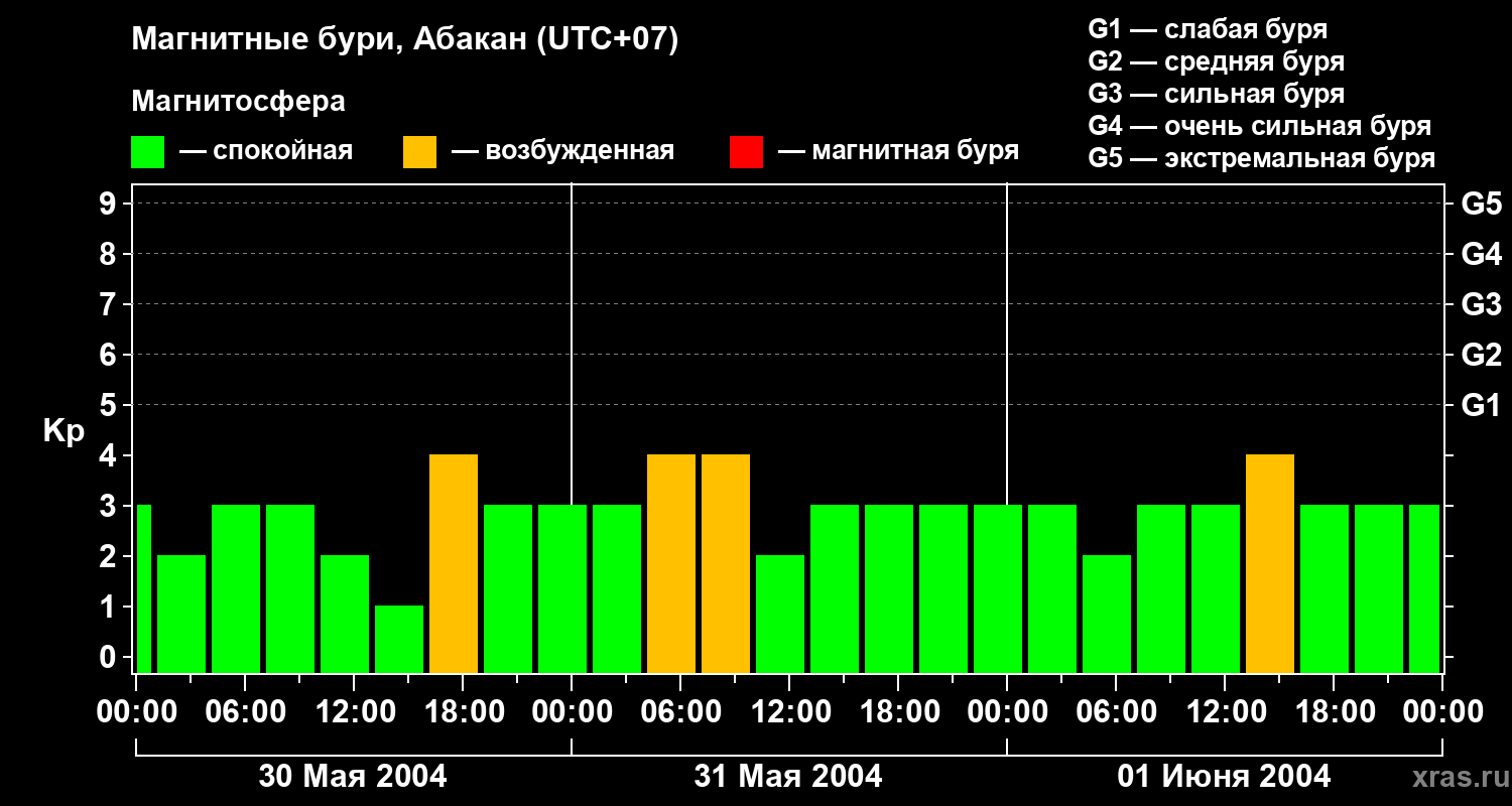 Изменения геомагнитного индекса Kp с 30 мая по 1 июня 2004 года для средних широт