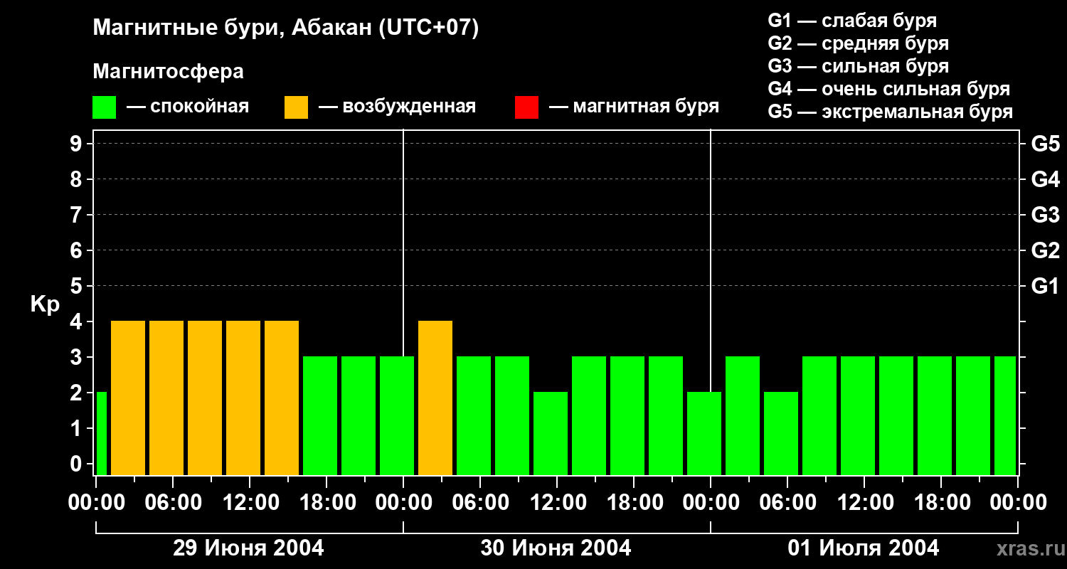 Изменения геомагнитного индекса Kp с 29 июня по 1 июля 2004 года для средних широт