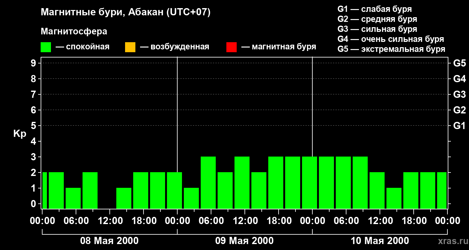 Изменения геомагнитного индекса Kp с 8 по 10 мая 2000 года для средних широт