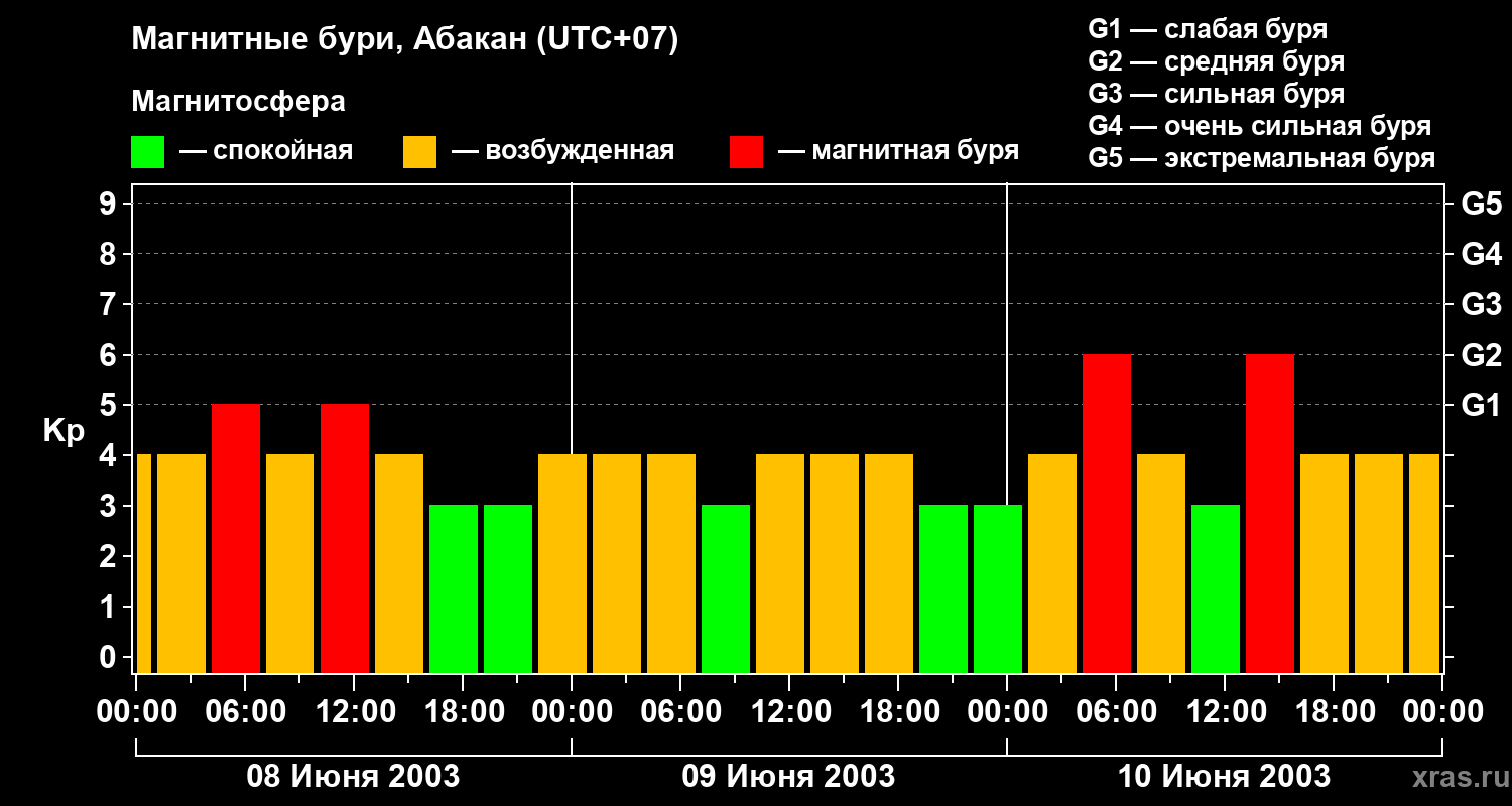 Изменения геомагнитного индекса Kp с 8 по 10 июня 2003 года для средних широт