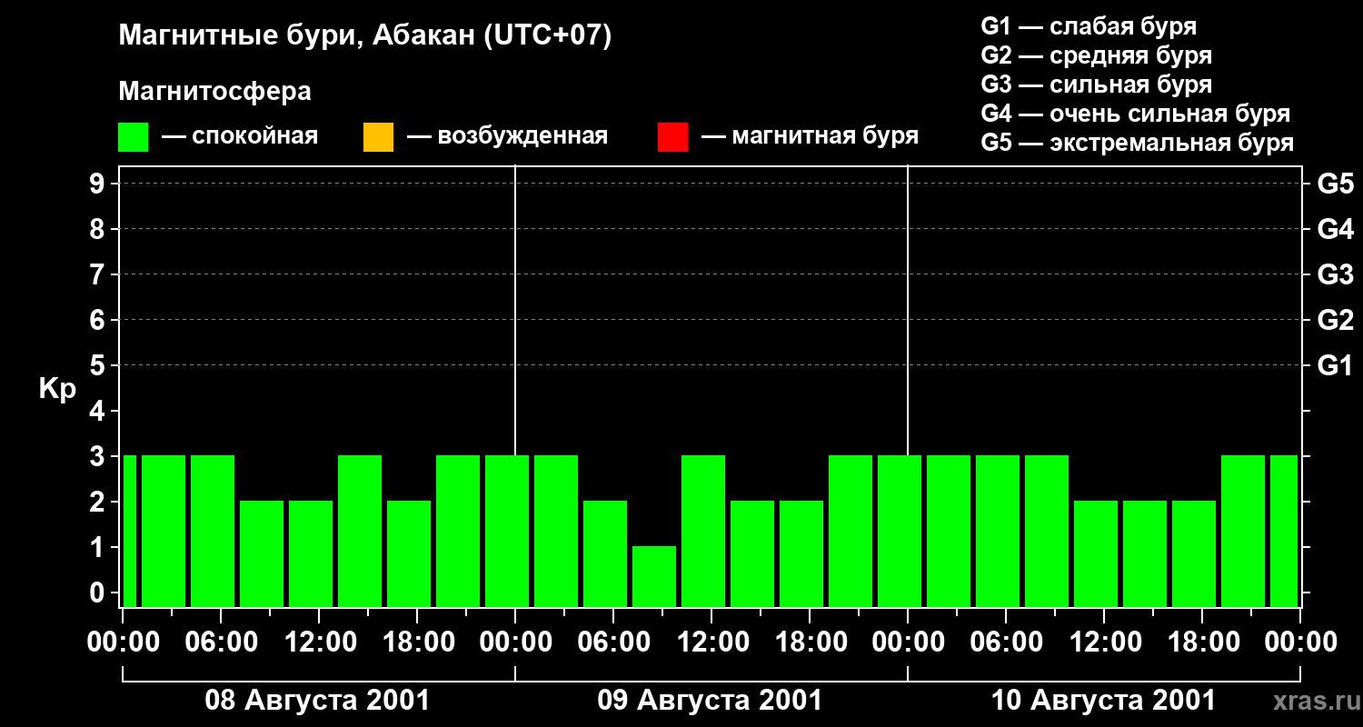 Изменения геомагнитного индекса Kp с 8 по 10 августа 2001 года для средних широт