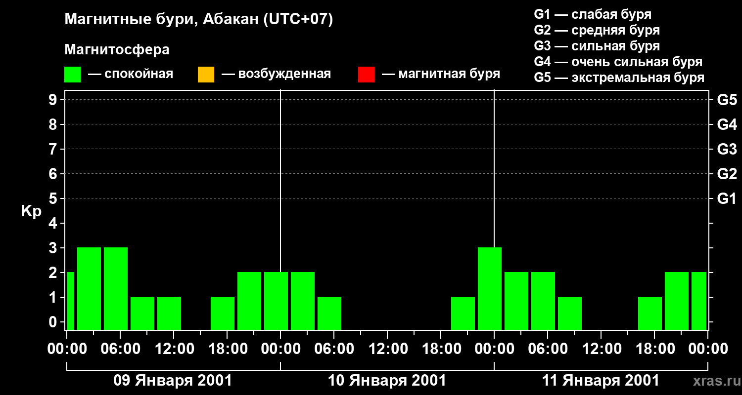 Изменения геомагнитного индекса Kp с 9 по 11 января 2001 года для средних широт