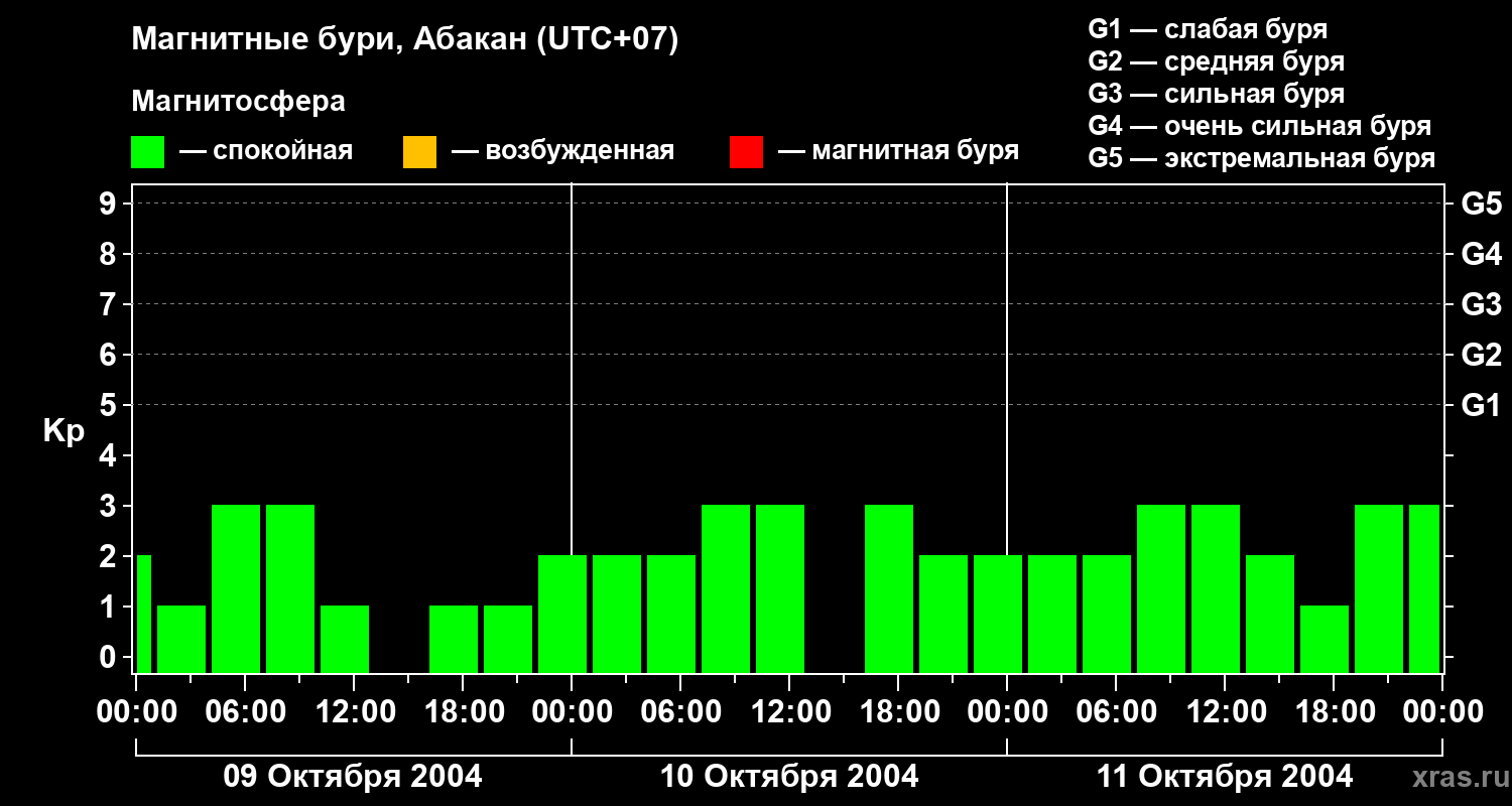 Изменения геомагнитного индекса Kp с 9 по 11 октября 2004 года для средних широт