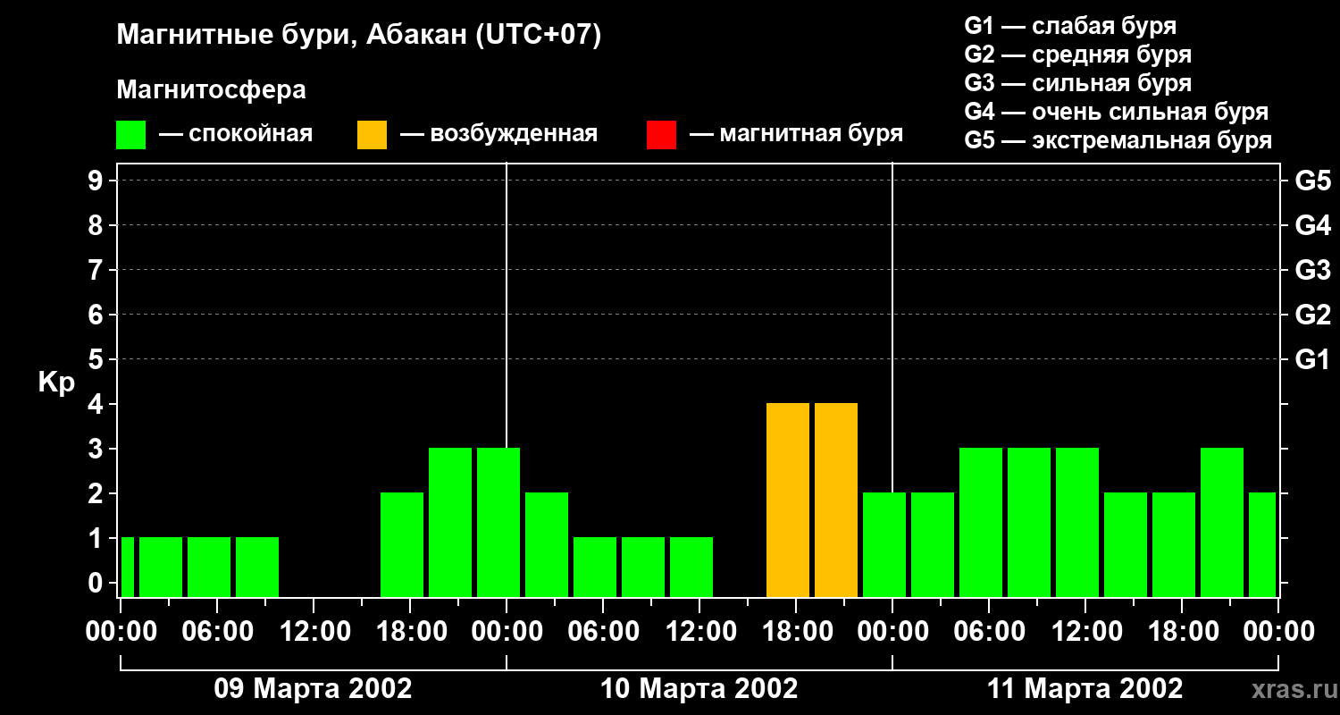 Изменения геомагнитного индекса Kp с 9 по 11 марта 2002 года для средних широт