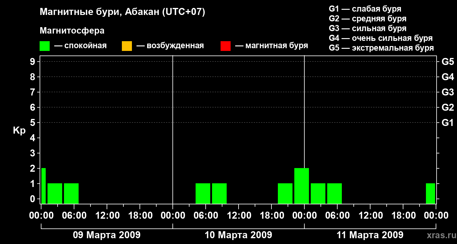 Изменения геомагнитного индекса Kp с 9 по 11 марта 2009 года для средних широт