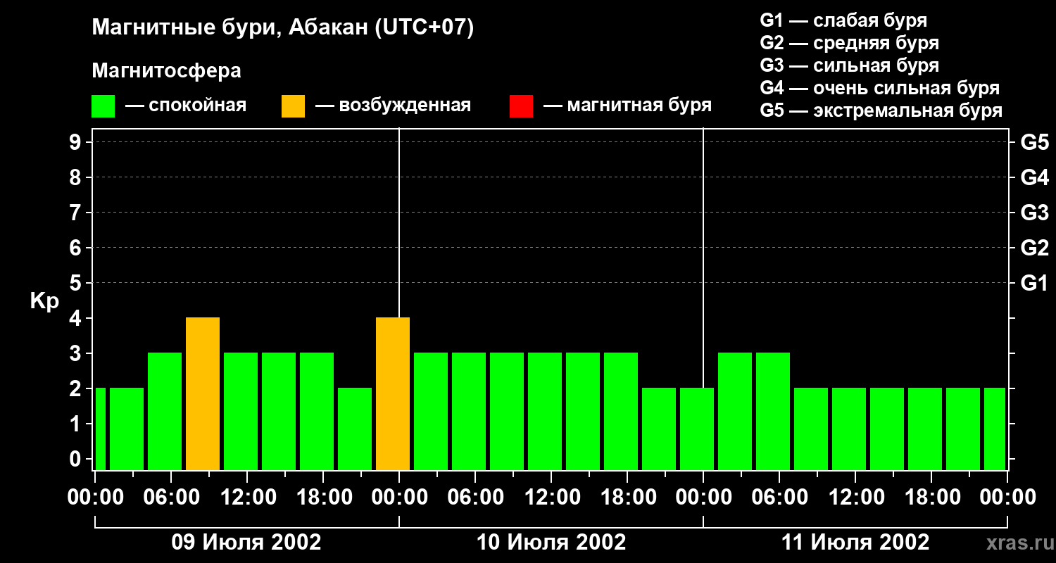 Изменения геомагнитного индекса Kp с 9 по 11 июля 2002 года для средних широт