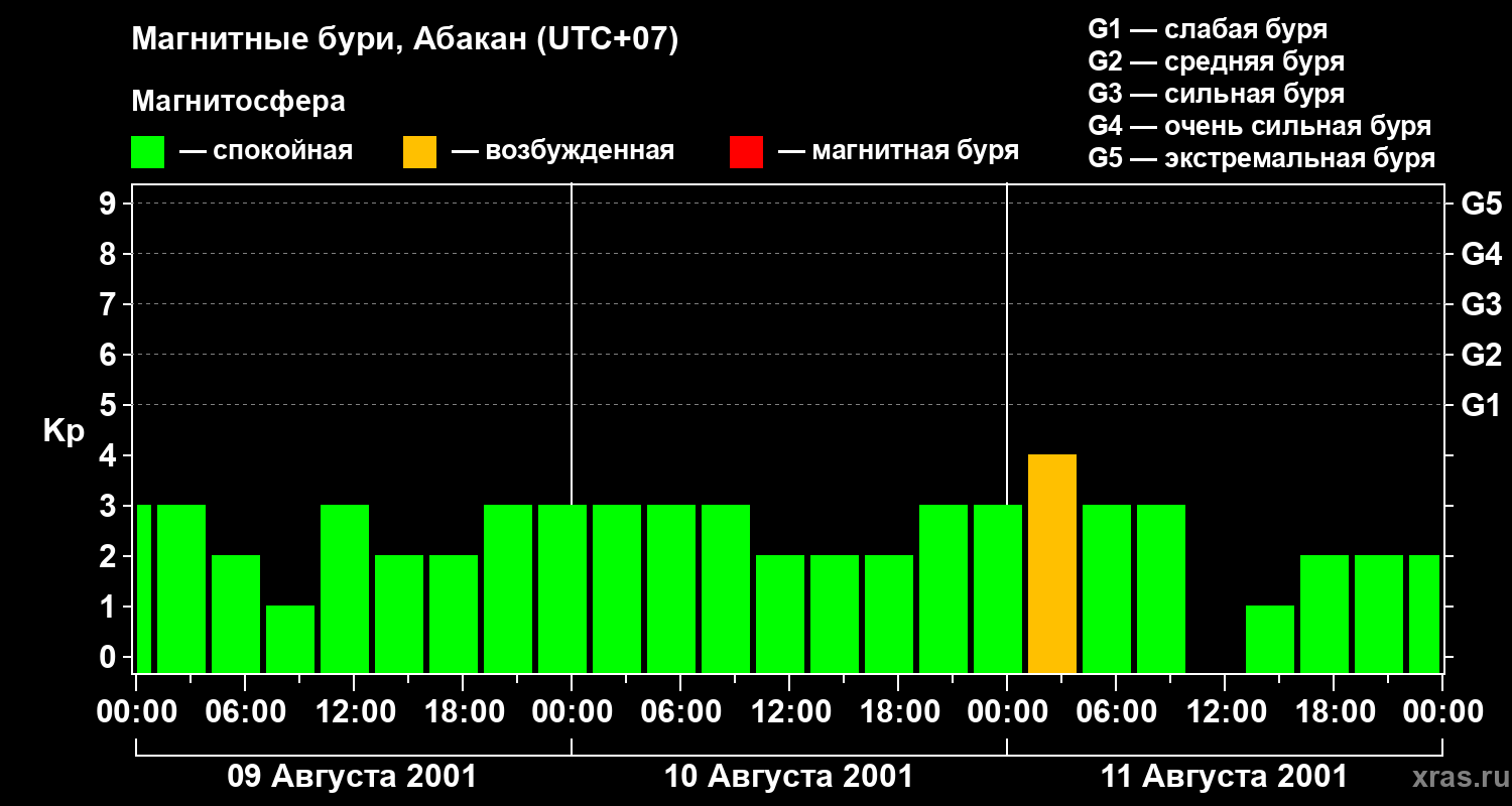 Изменения геомагнитного индекса Kp с 9 по 11 августа 2001 года для средних широт