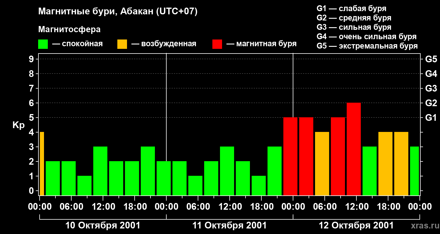 Изменения геомагнитного индекса Kp с 10 по 12 октября 2001 года для средних широт