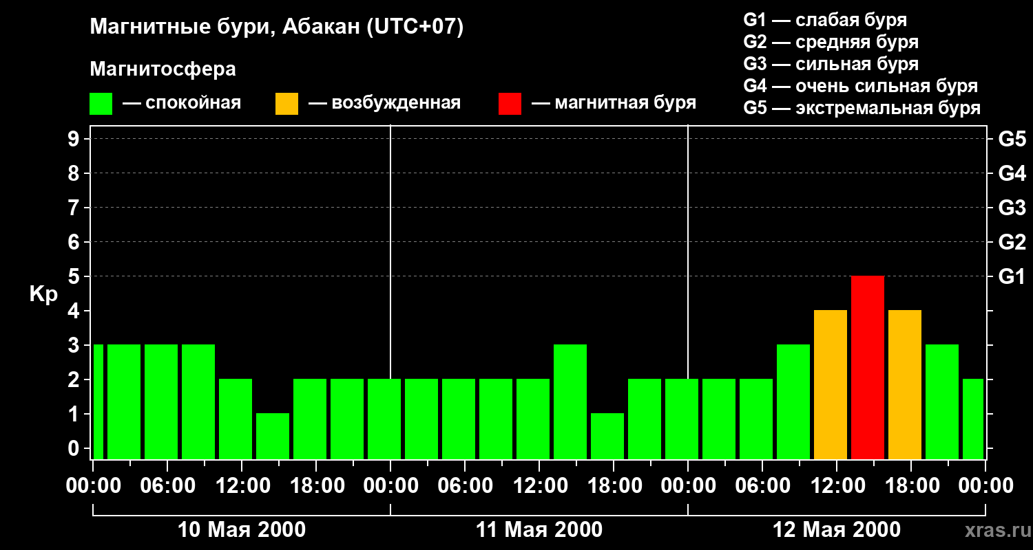 Изменения геомагнитного индекса Kp с 10 по 12 мая 2000 года для средних широт