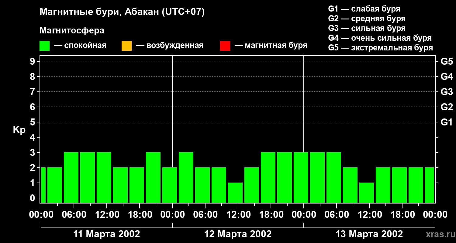 Изменения геомагнитного индекса Kp с 11 по 13 марта 2002 года для средних широт