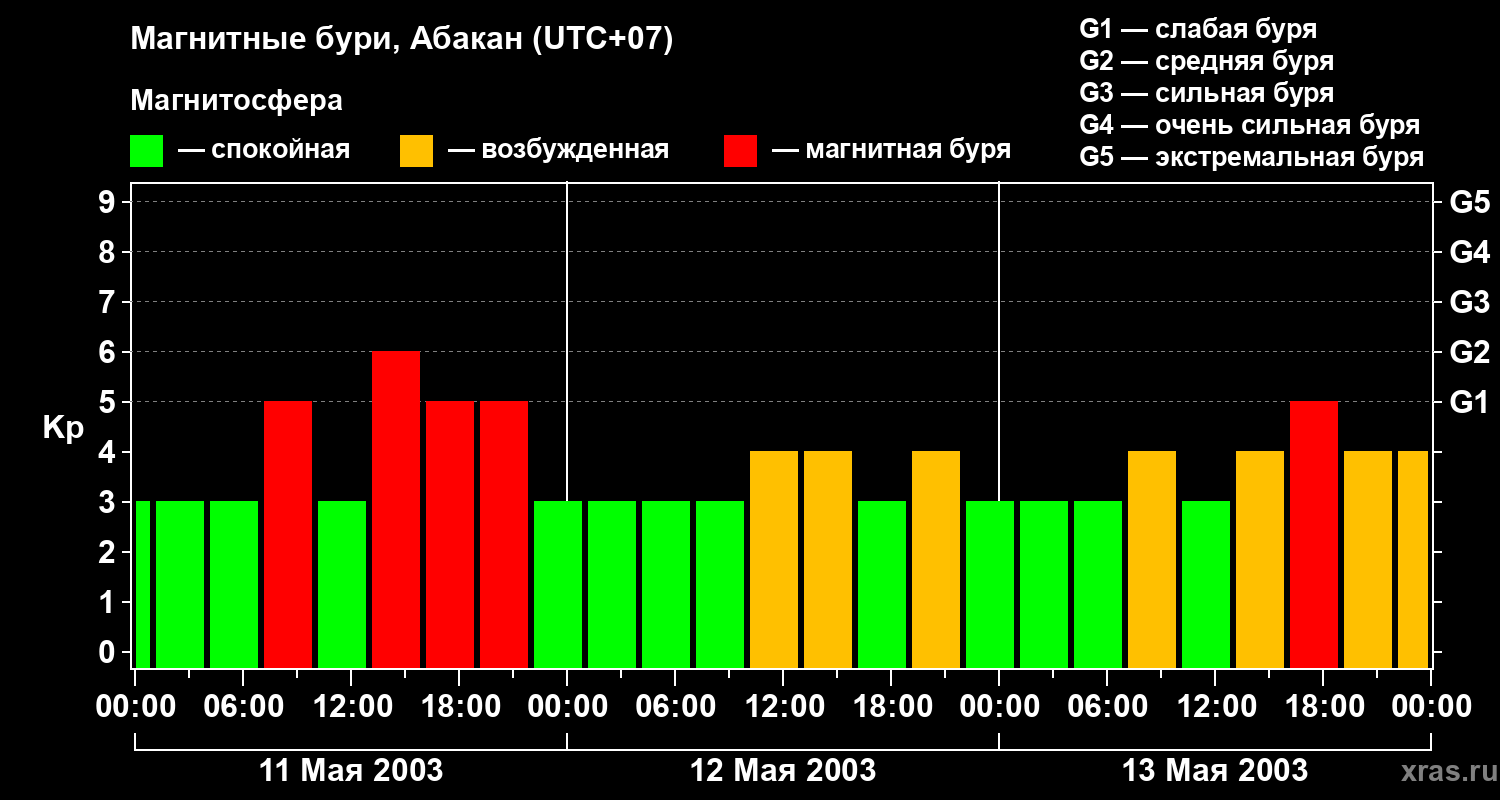 Изменения геомагнитного индекса Kp с 11 по 13 мая 2003 года для средних широт