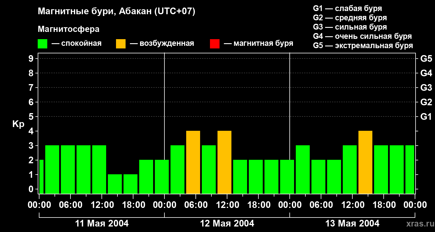 Изменения геомагнитного индекса Kp с 11 по 13 мая 2004 года для средних широт