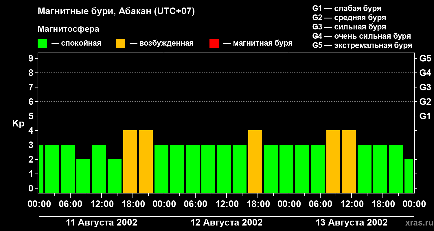 Изменения геомагнитного индекса Kp с 11 по 13 августа 2002 года для средних широт