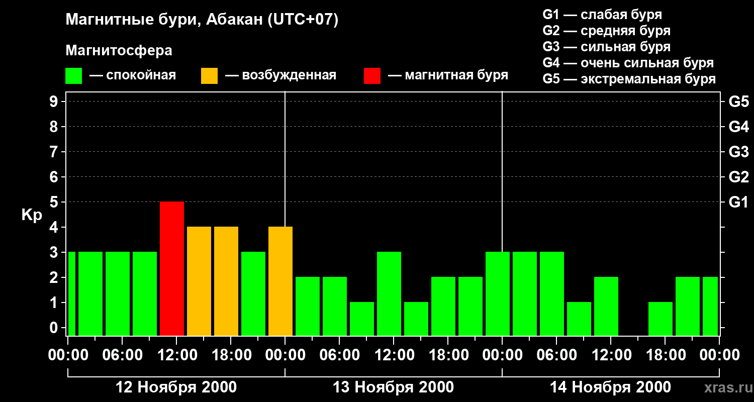 Изменения геомагнитного индекса Kp с 12 по 14 ноября 2000 года для средних широт