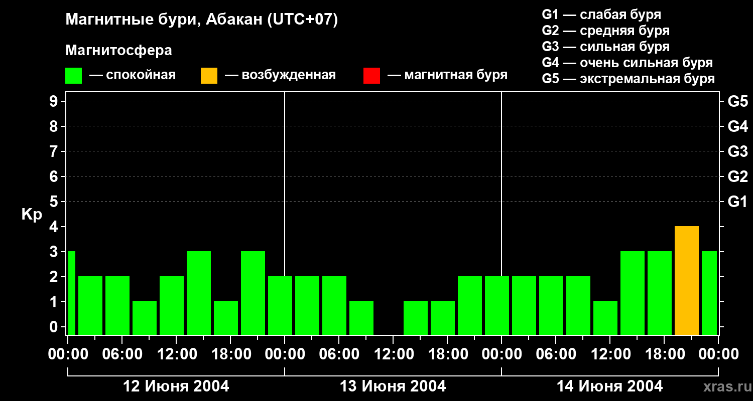 Изменения геомагнитного индекса Kp с 12 по 14 июня 2004 года для средних широт