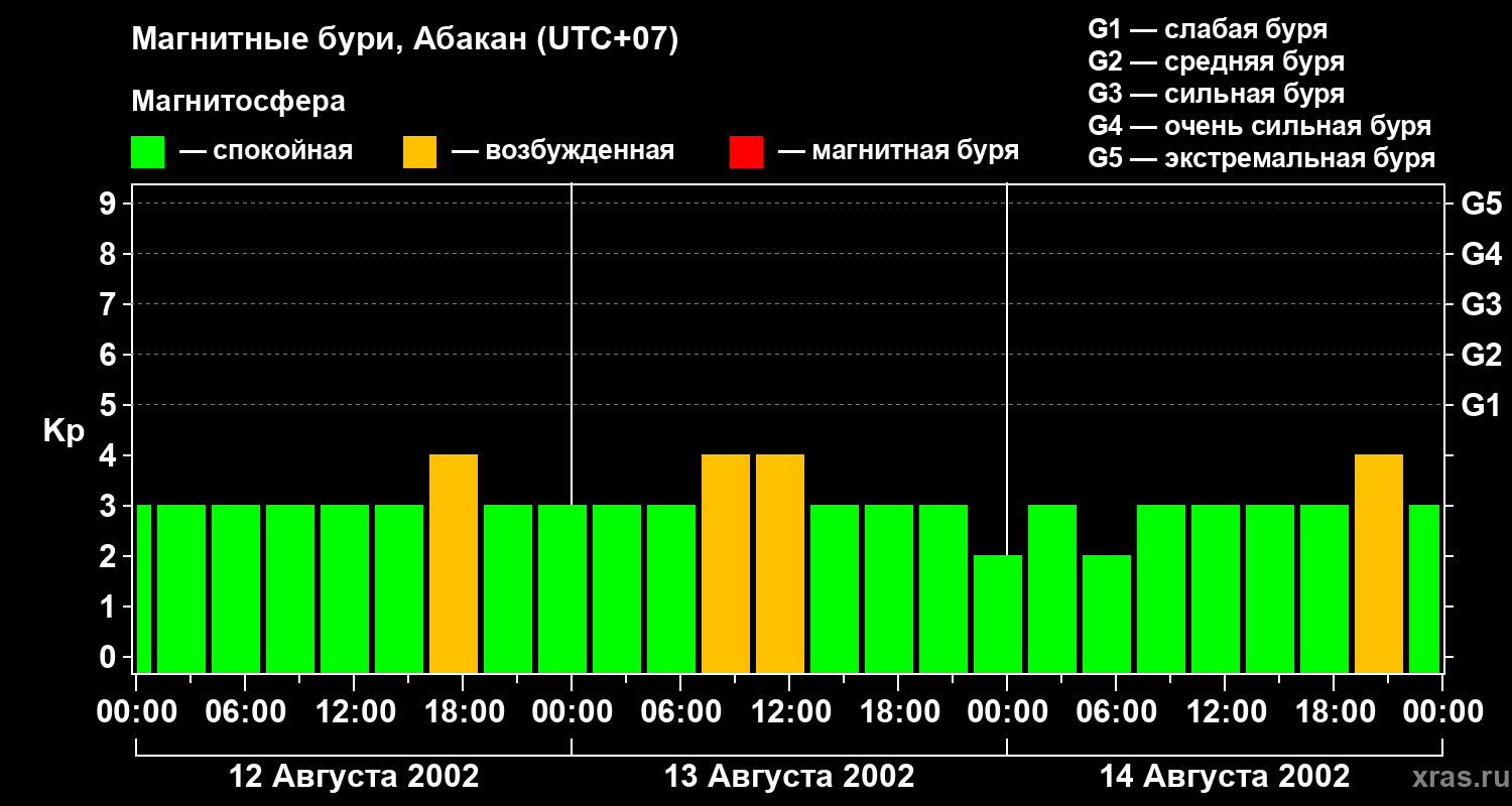Изменения геомагнитного индекса Kp с 12 по 14 августа 2002 года для средних широт