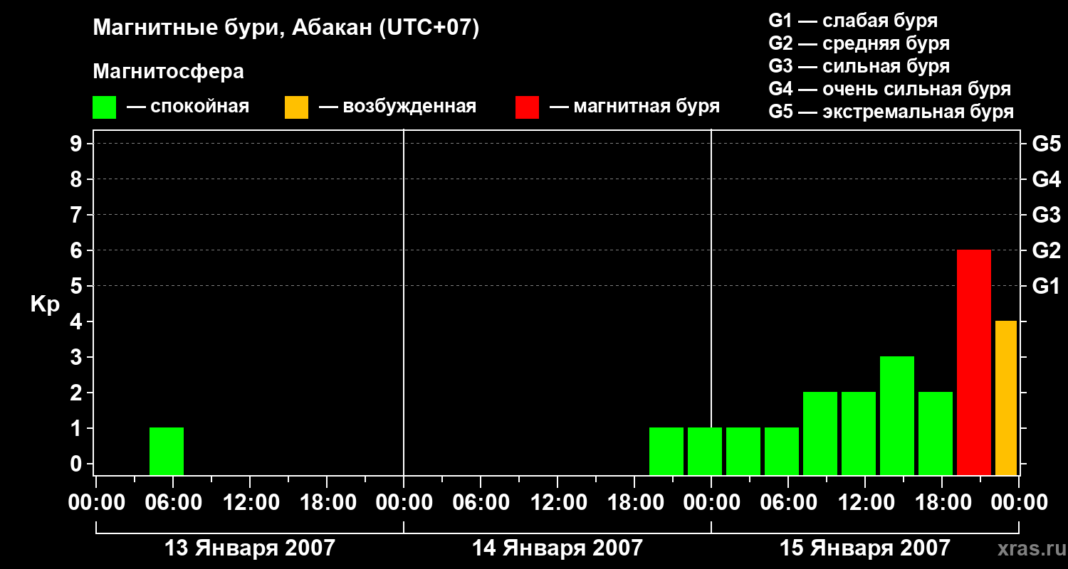 Изменения геомагнитного индекса Kp с 13 по 15 января 2007 года для средних широт