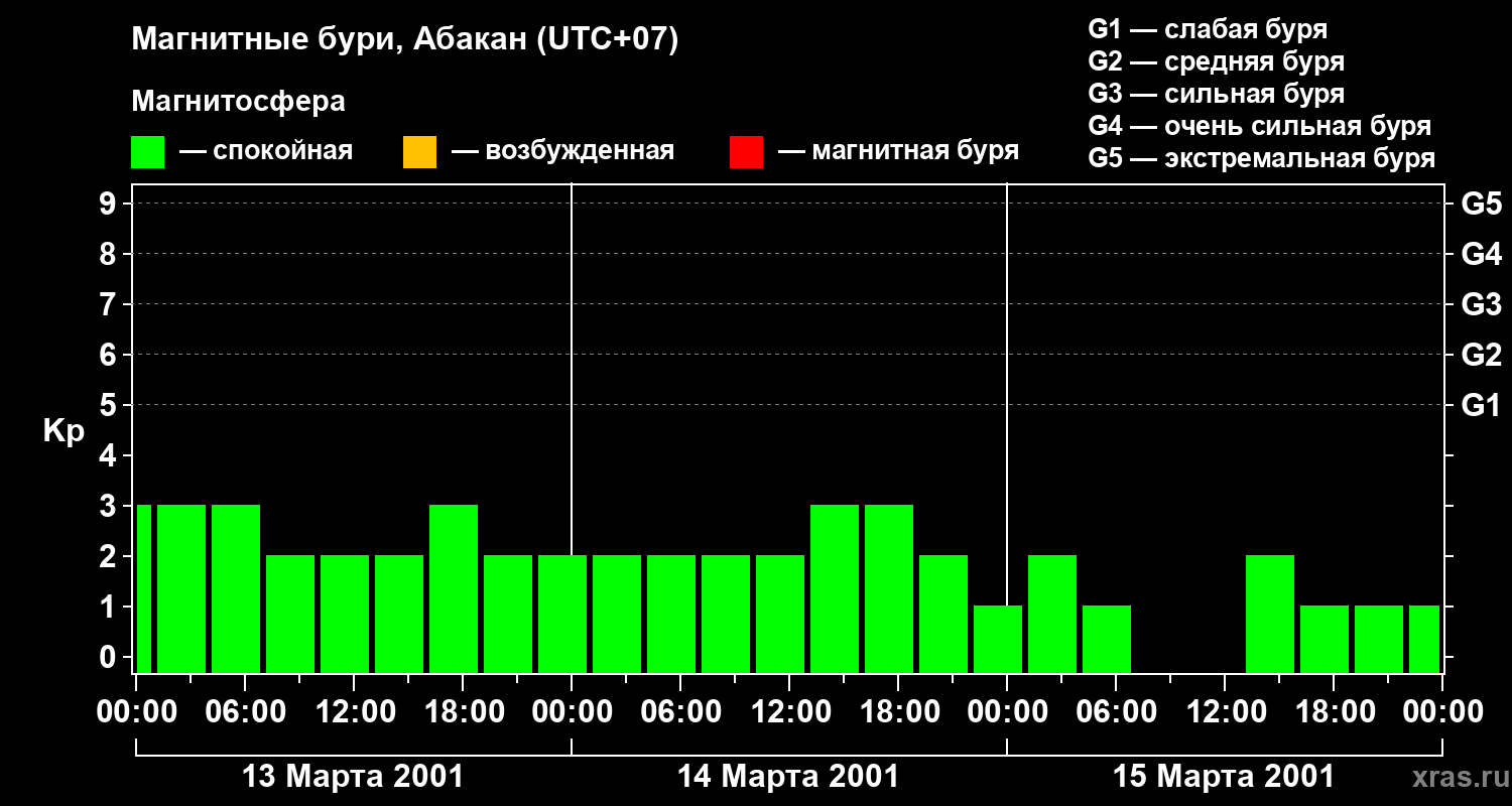 Изменения геомагнитного индекса Kp с 13 по 15 марта 2001 года для средних широт