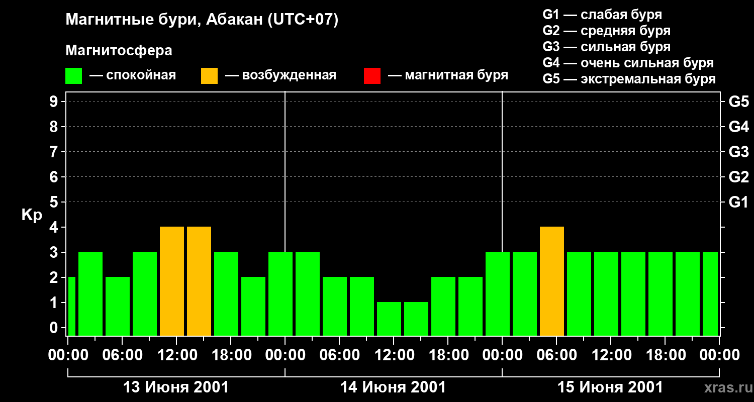 Изменения геомагнитного индекса Kp с 13 по 15 июня 2001 года для средних широт