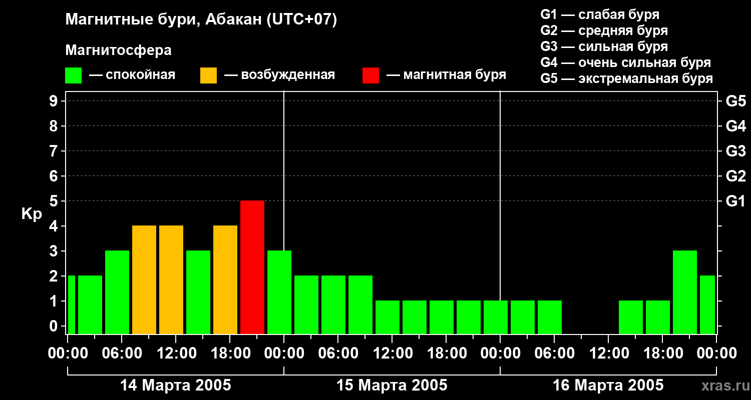Изменения геомагнитного индекса Kp с 14 по 16 марта 2005 года для средних широт