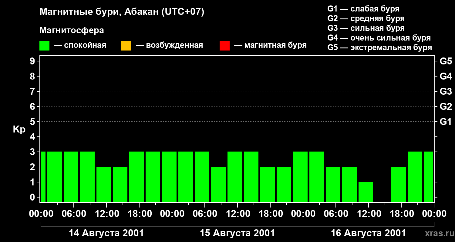 Изменения геомагнитного индекса Kp с 14 по 16 августа 2001 года для средних широт