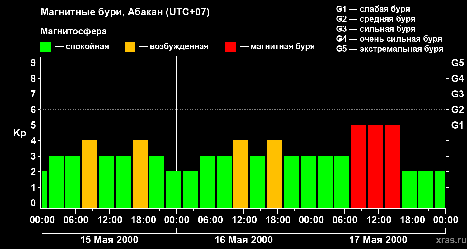Изменения геомагнитного индекса Kp с 15 по 17 мая 2000 года для средних широт