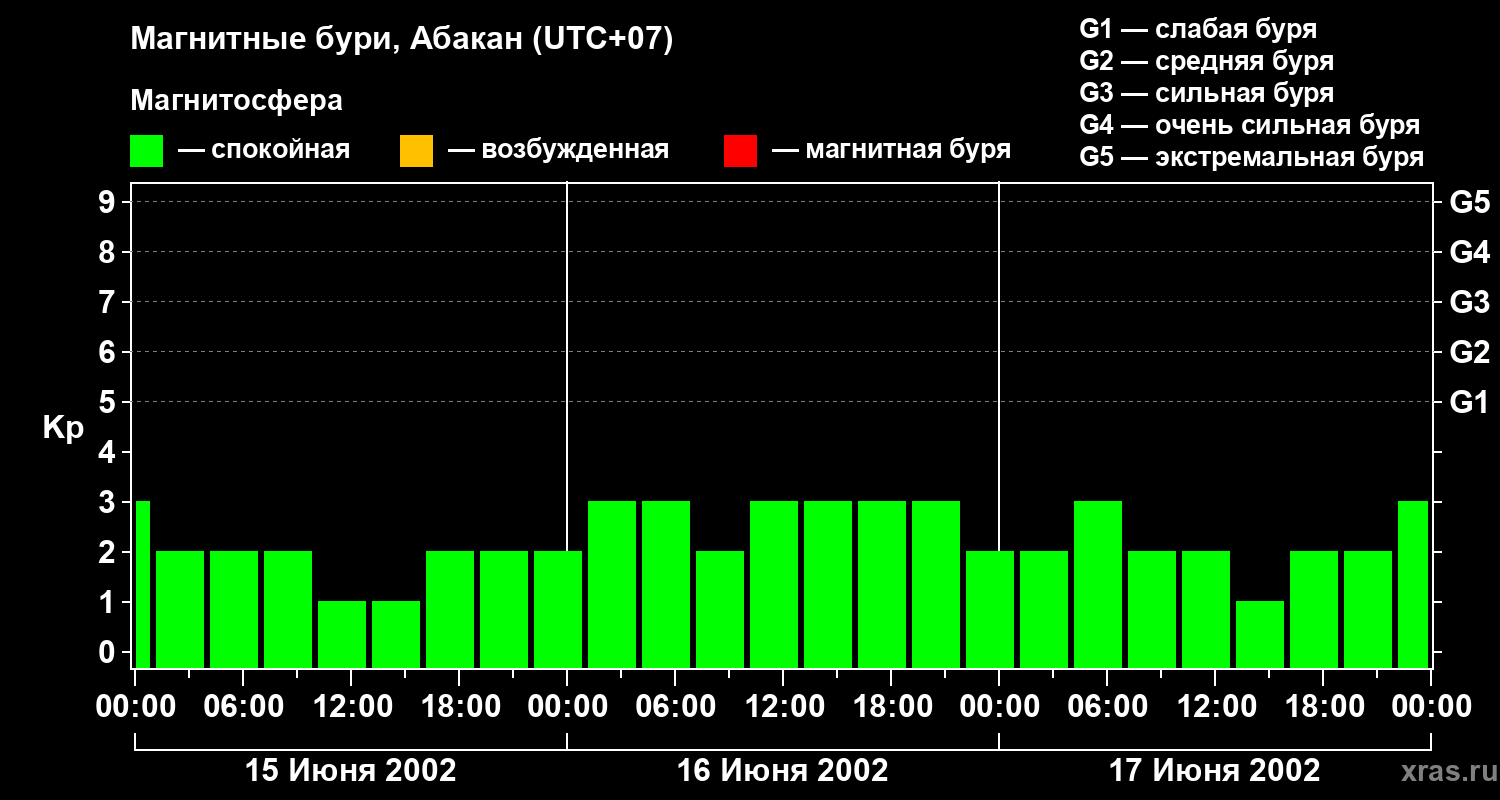 Изменения геомагнитного индекса Kp с 15 по 17 июня 2002 года для средних широт