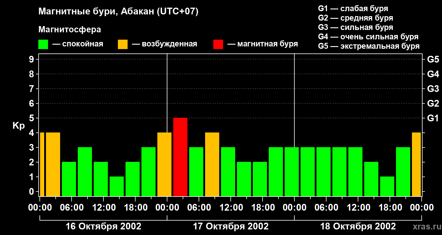 Изменения геомагнитного индекса Kp с 16 по 18 октября 2002 года для средних широт
