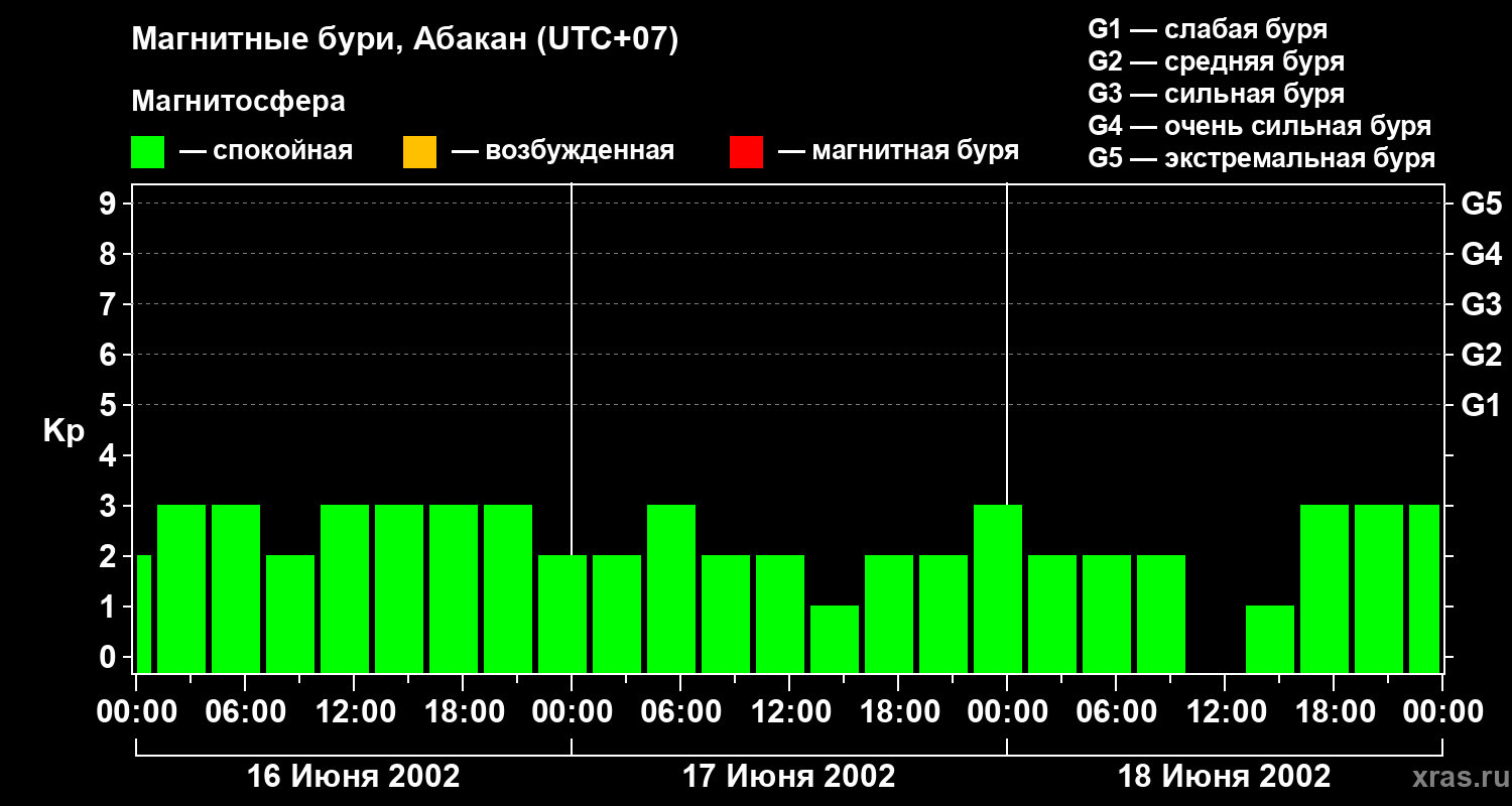 Изменения геомагнитного индекса Kp с 16 по 18 июня 2002 года для средних широт