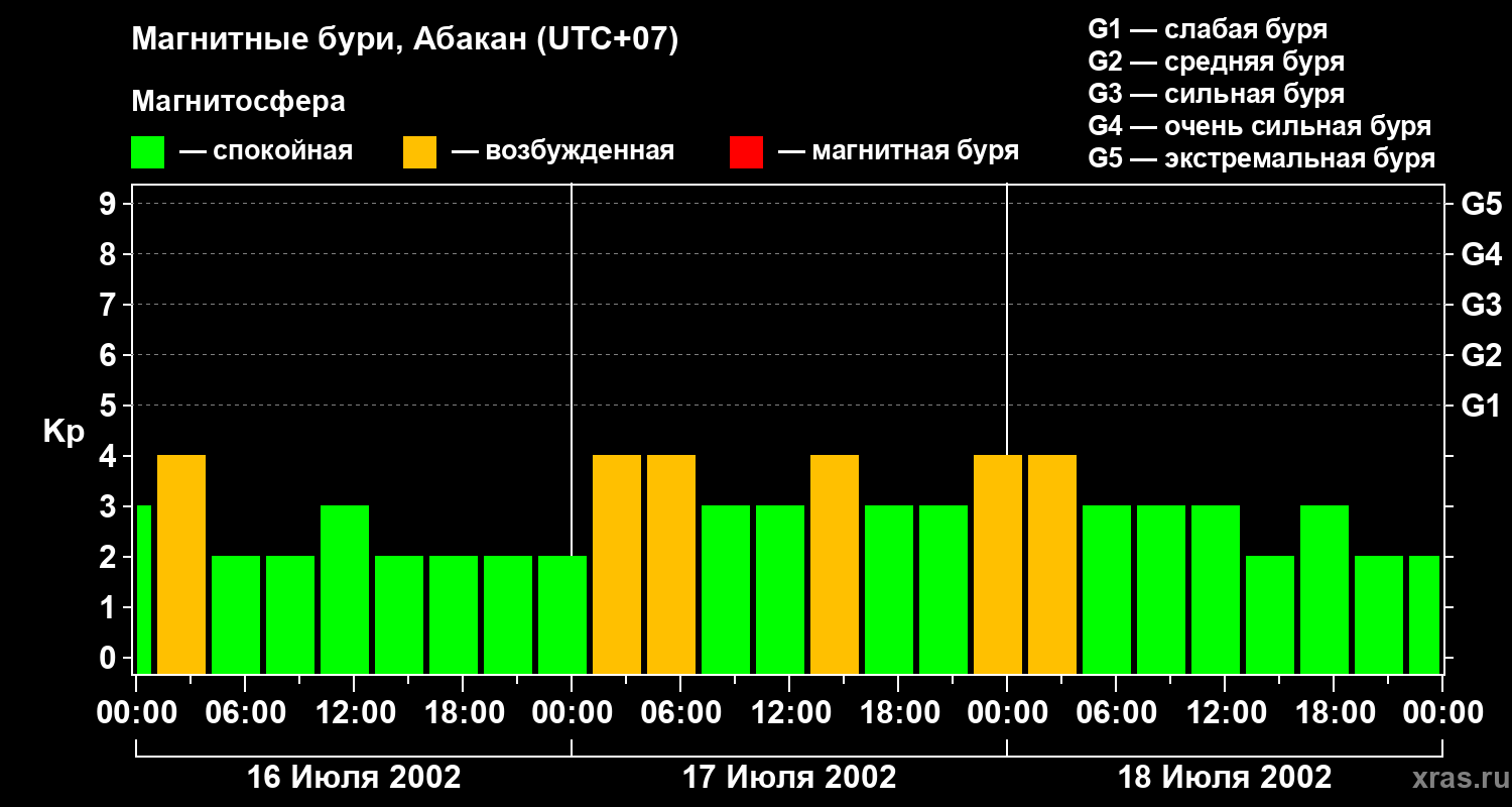 Изменения геомагнитного индекса Kp с 16 по 18 июля 2002 года для средних широт