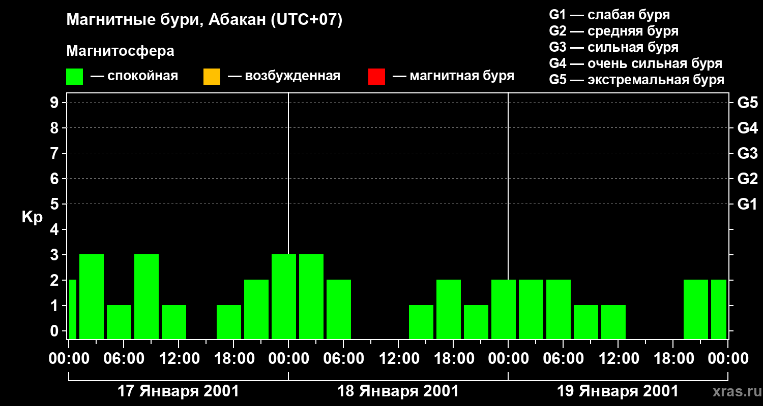 Изменения геомагнитного индекса Kp с 17 по 19 января 2001 года для средних широт