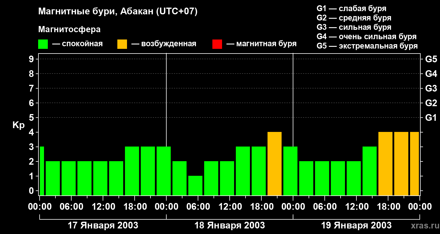 Изменения геомагнитного индекса Kp с 17 по 19 января 2003 года для средних широт