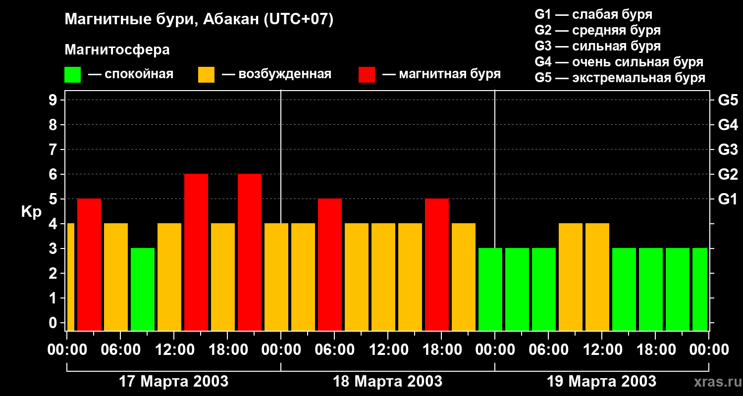 Изменения геомагнитного индекса Kp с 17 по 19 марта 2003 года для средних широт