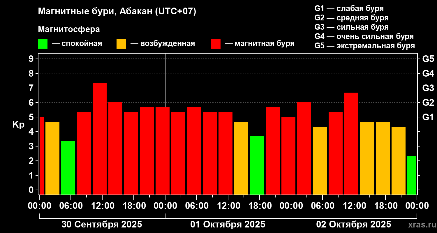 Изменения геомагнитного индекса Kp с 30 сентября по 2 октября 2025 года для средних широт