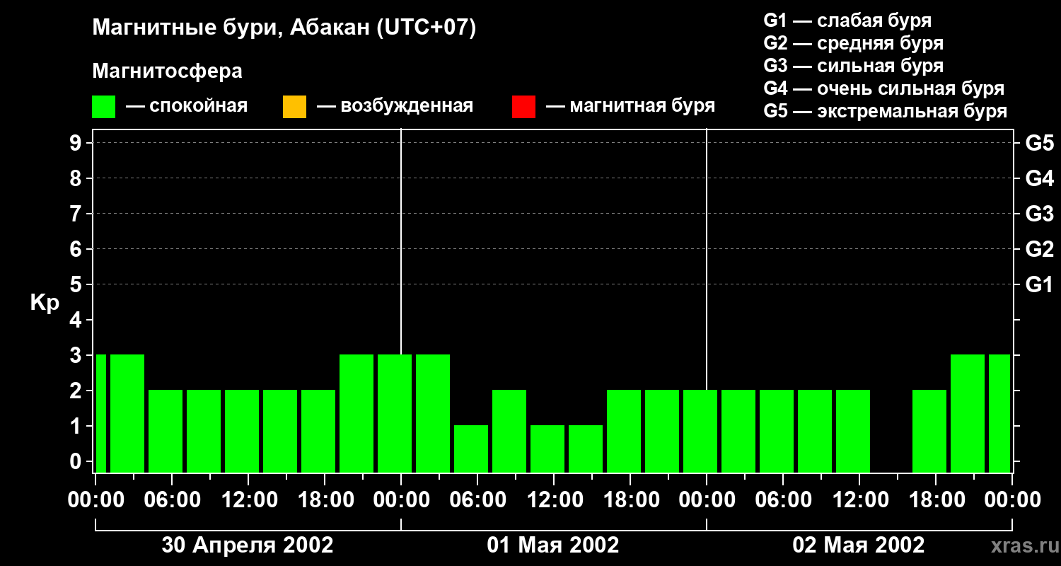 Изменения геомагнитного индекса Kp с 30 апреля по 2 мая 2002 года для средних широт