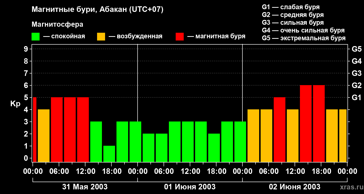 Изменения геомагнитного индекса Kp с 31 мая по 2 июня 2003 года для средних широт