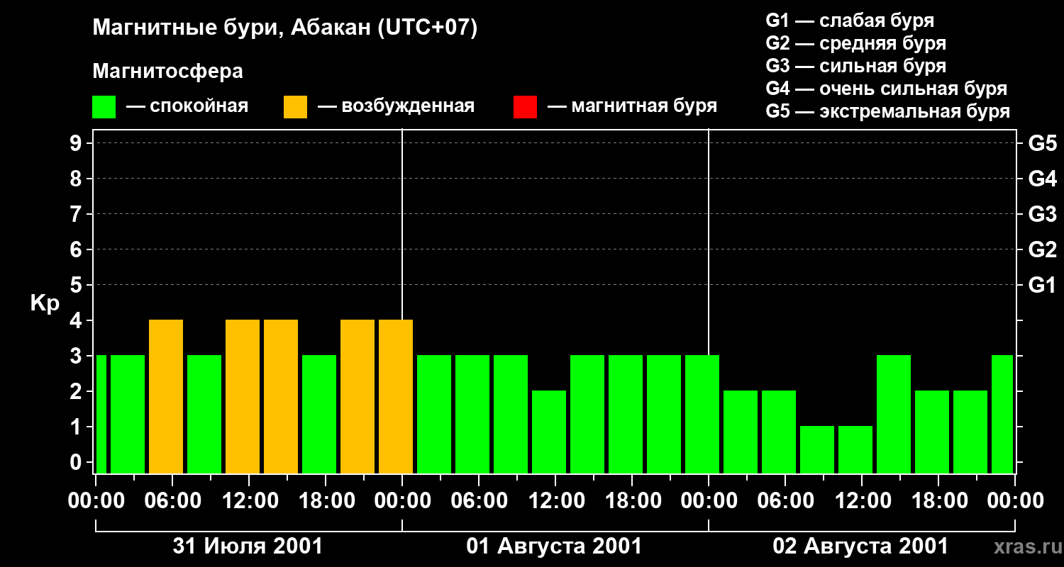 Изменения геомагнитного индекса Kp с 31 июля по 2 августа 2001 года для средних широт