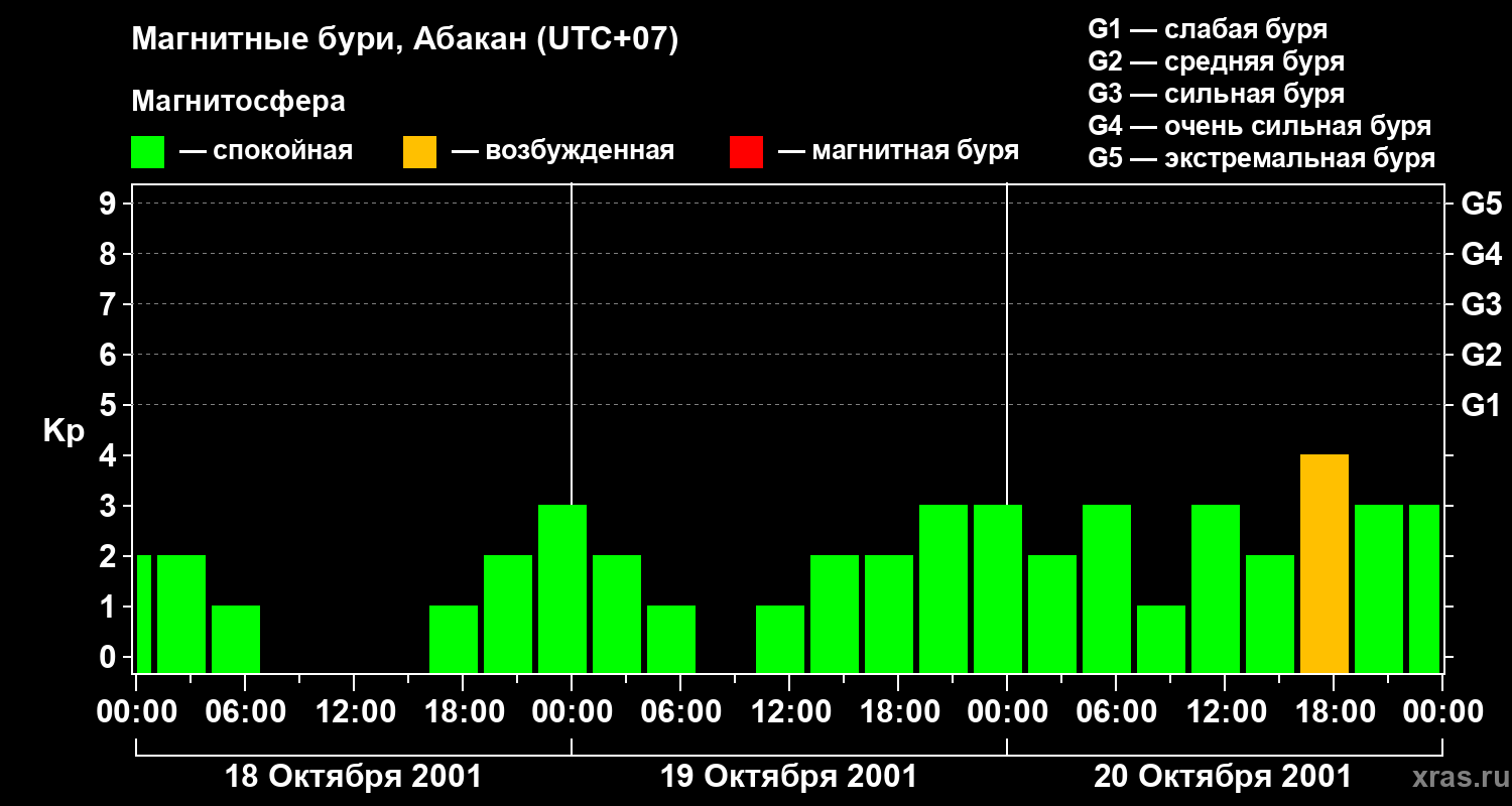 Изменения геомагнитного индекса Kp с 18 по 20 октября 2001 года для средних широт