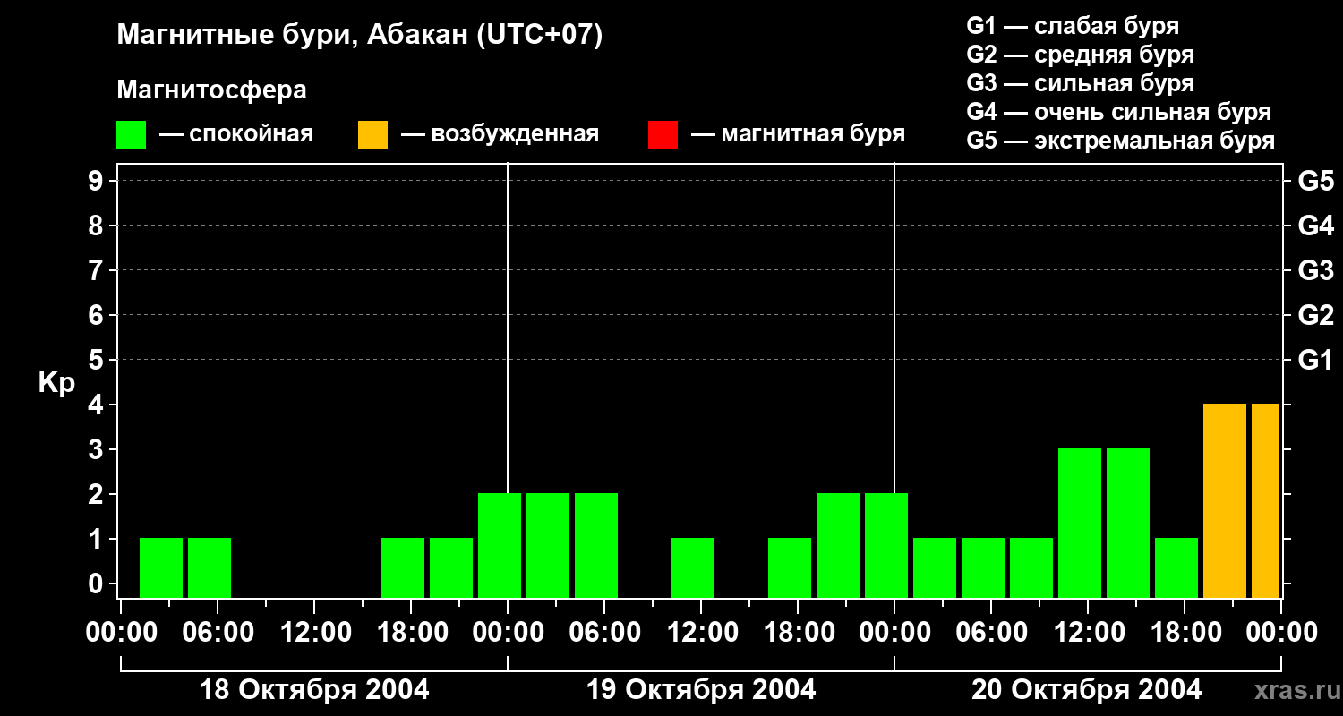 Изменения геомагнитного индекса Kp с 18 по 20 октября 2004 года для средних широт
