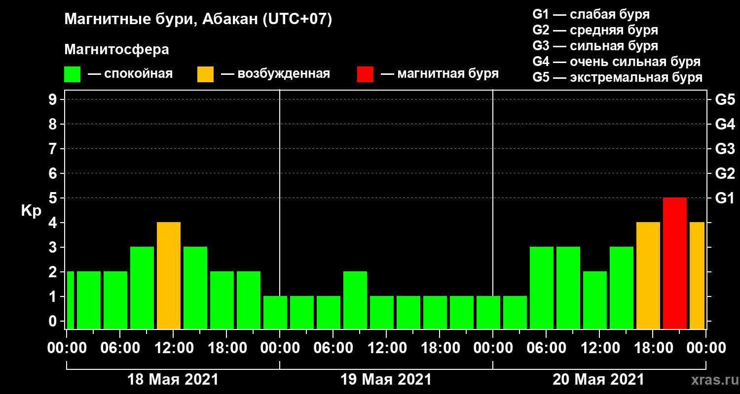 Изменения геомагнитного индекса Kp с 18 по 20 мая 2021 года для средних широт
