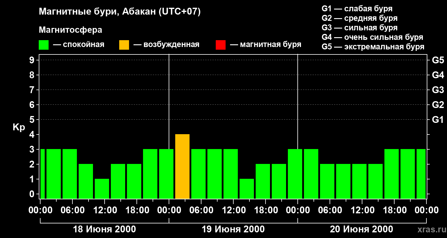 Изменения геомагнитного индекса Kp с 18 по 20 июня 2000 года для средних широт