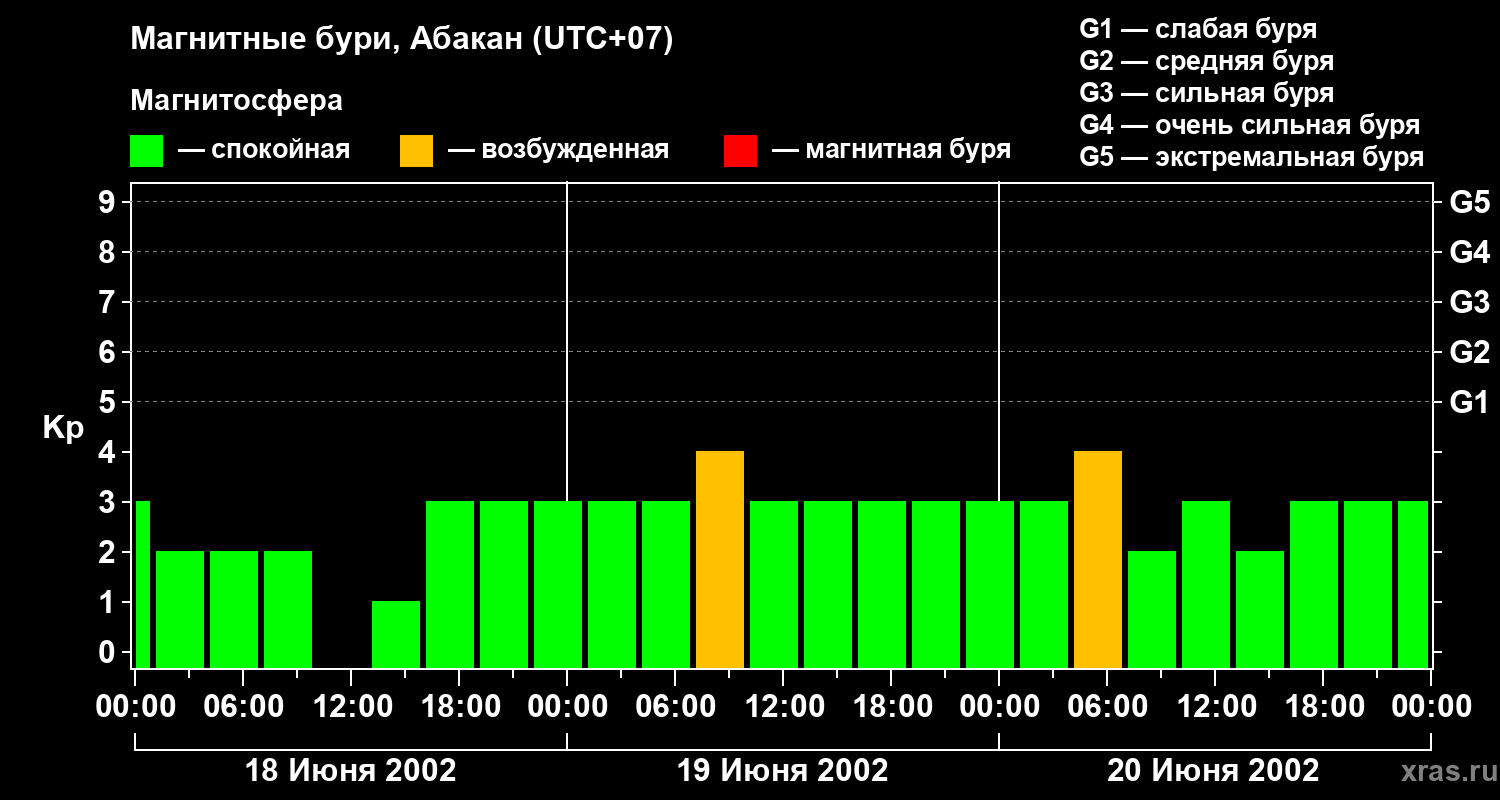Изменения геомагнитного индекса Kp с 18 по 20 июня 2002 года для средних широт