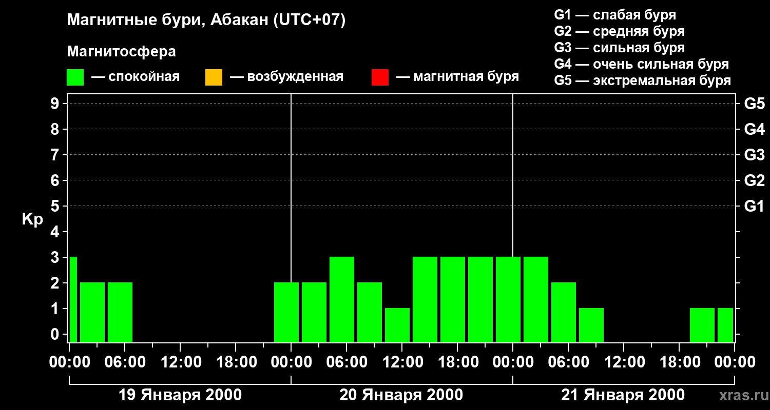 Изменения геомагнитного индекса Kp с 19 по 21 января 2000 года для средних широт