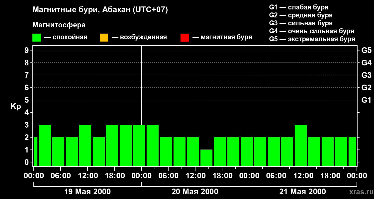 Изменения геомагнитного индекса Kp с 19 по 21 мая 2000 года для средних широт
