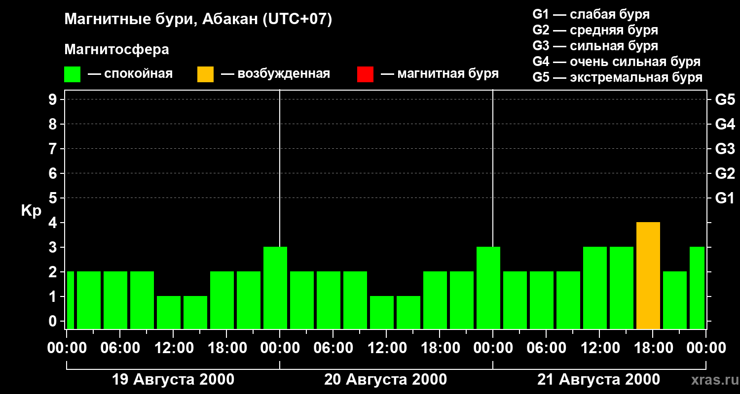 Изменения геомагнитного индекса Kp с 19 по 21 августа 2000 года для средних широт