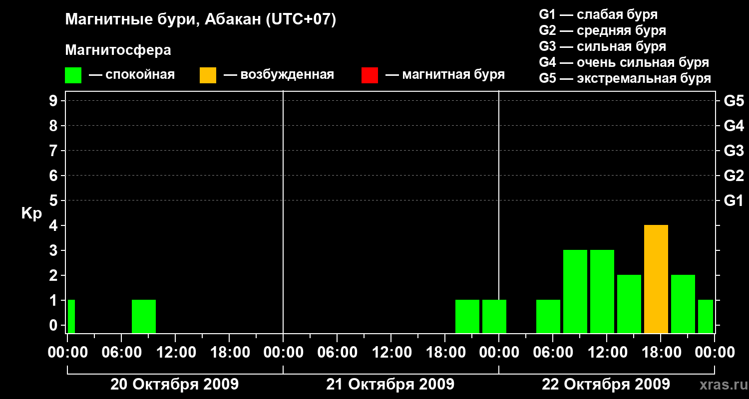 Изменения геомагнитного индекса Kp с 20 по 22 октября 2009 года для средних широт