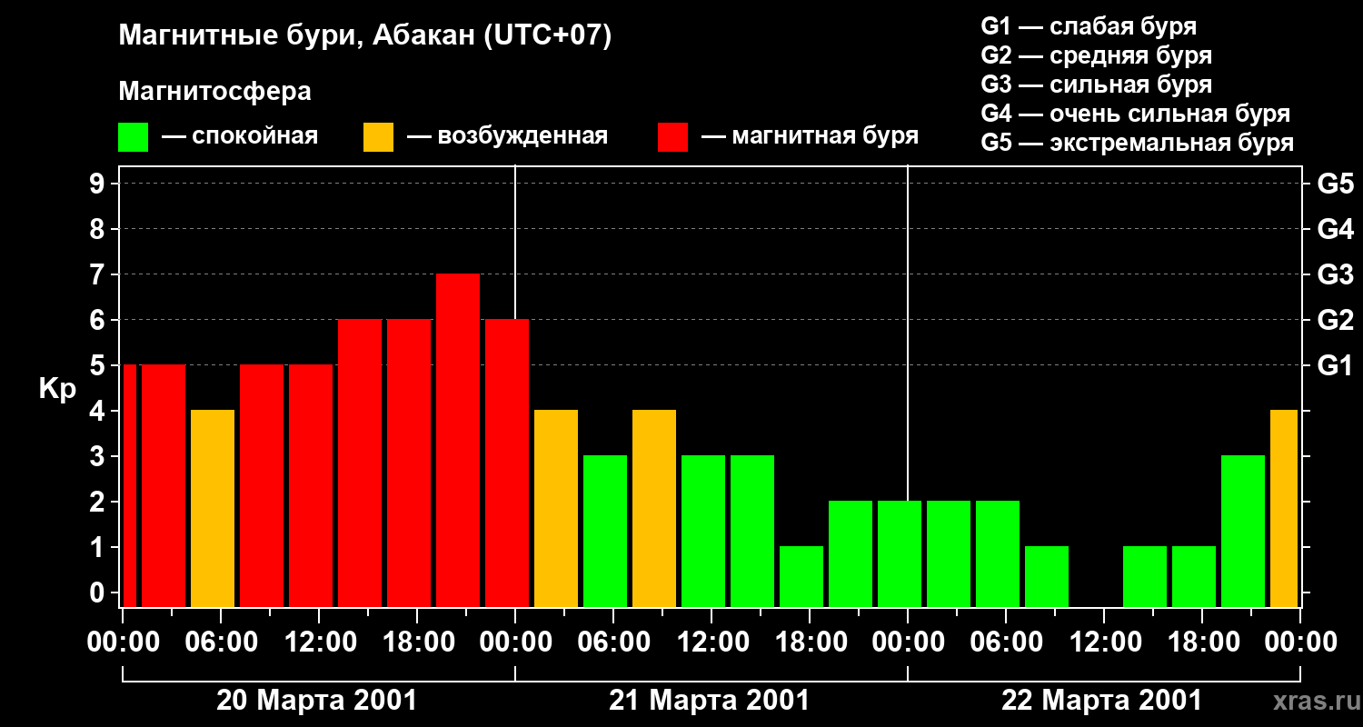 Изменения геомагнитного индекса Kp с 20 по 22 марта 2001 года для средних широт