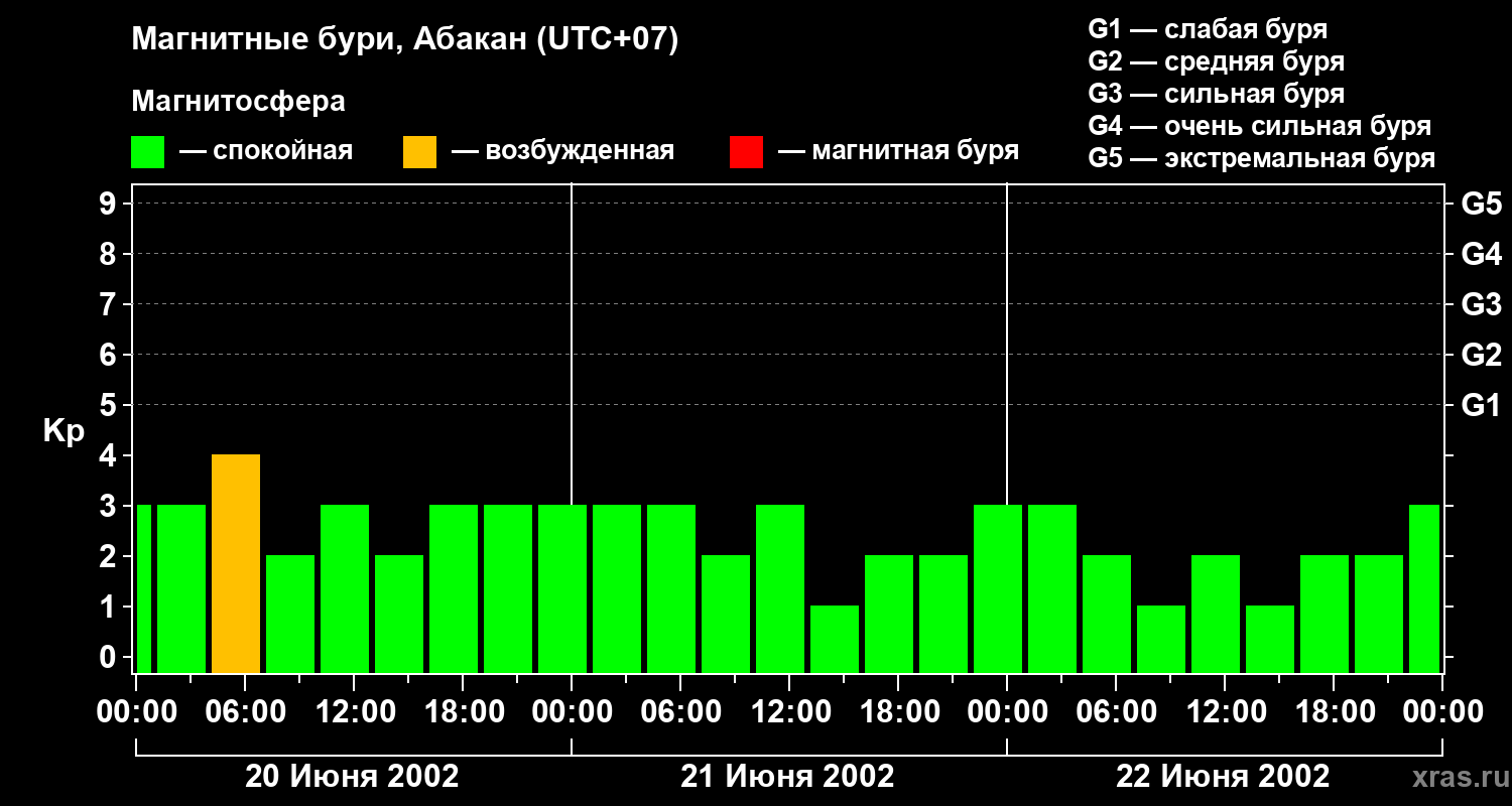 Изменения геомагнитного индекса Kp с 20 по 22 июня 2002 года для средних широт