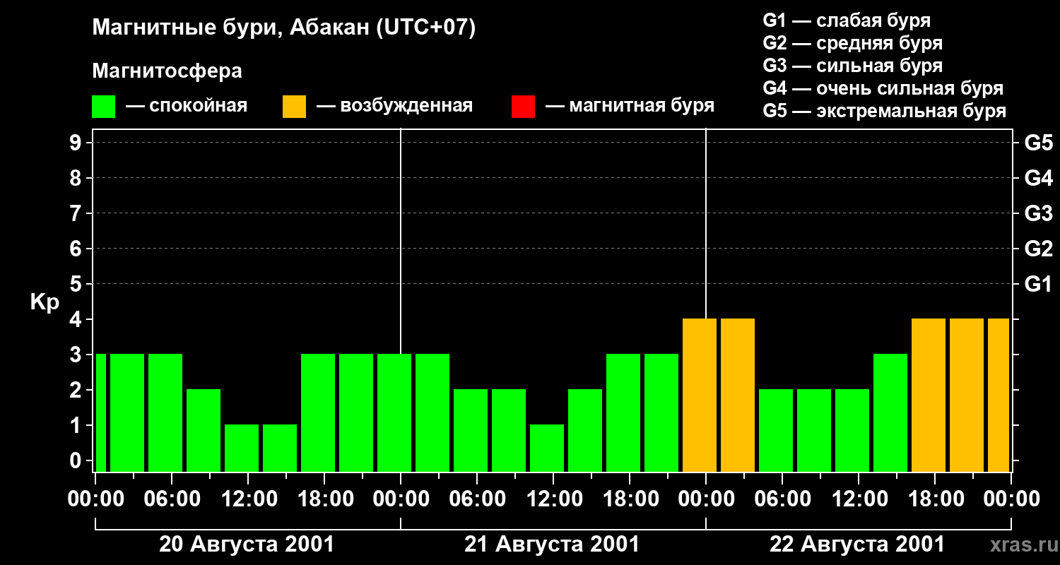 Изменения геомагнитного индекса Kp с 20 по 22 августа 2001 года для средних широт